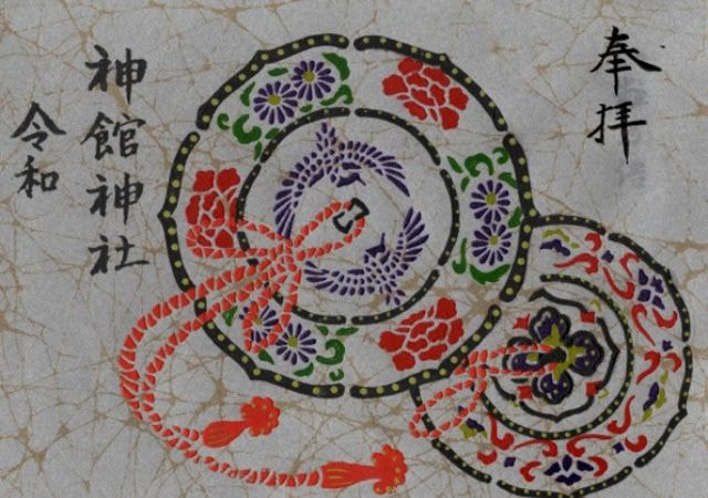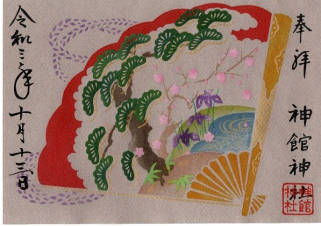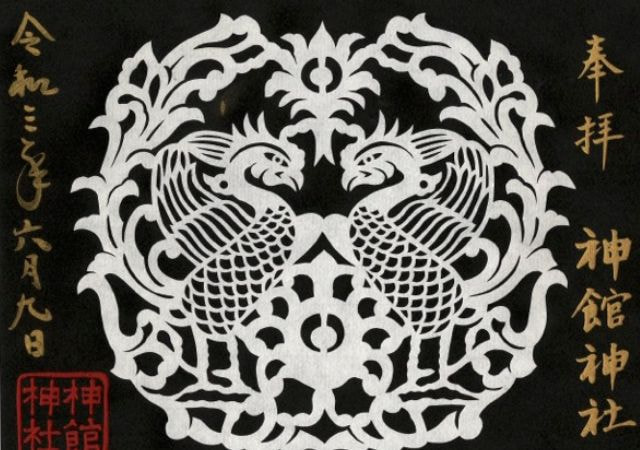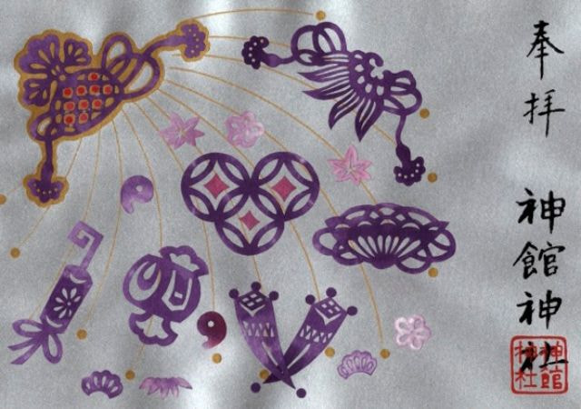 神館神社の御朱印は、一般的な御朱印だけではなく、三重県の誇る伝統工芸(伊勢型紙彫刻)を使って手作りによる版画絵の御朱印などもございます。何枚もの版画絵を重ね合わせた職人技の世界です。専門の作家による御朱印に宮司が祈りを込めました。