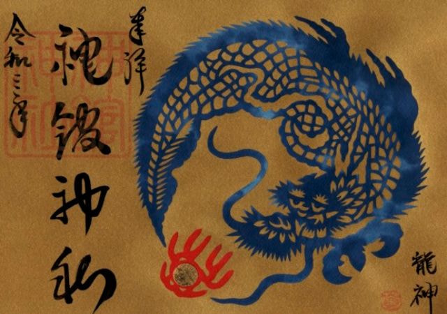 伊勢型紙を駆使し、藍染にて龍神様をお染めいたしました。