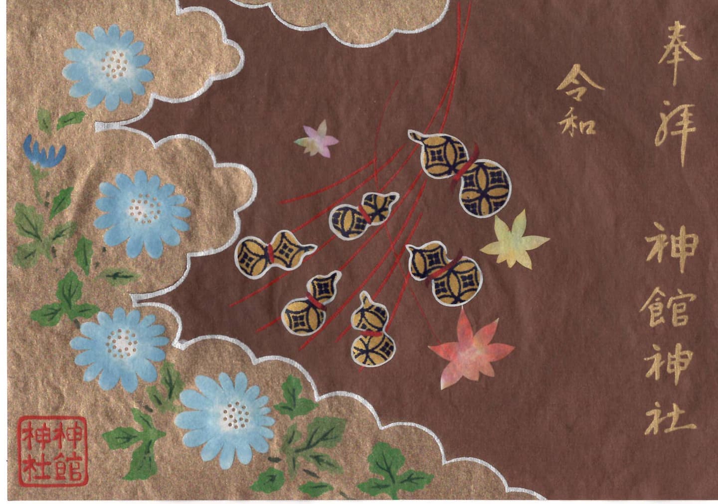 「蘇芳染め」で美濃和紙を赤く染め金の糸目で版画刷りいたしました。